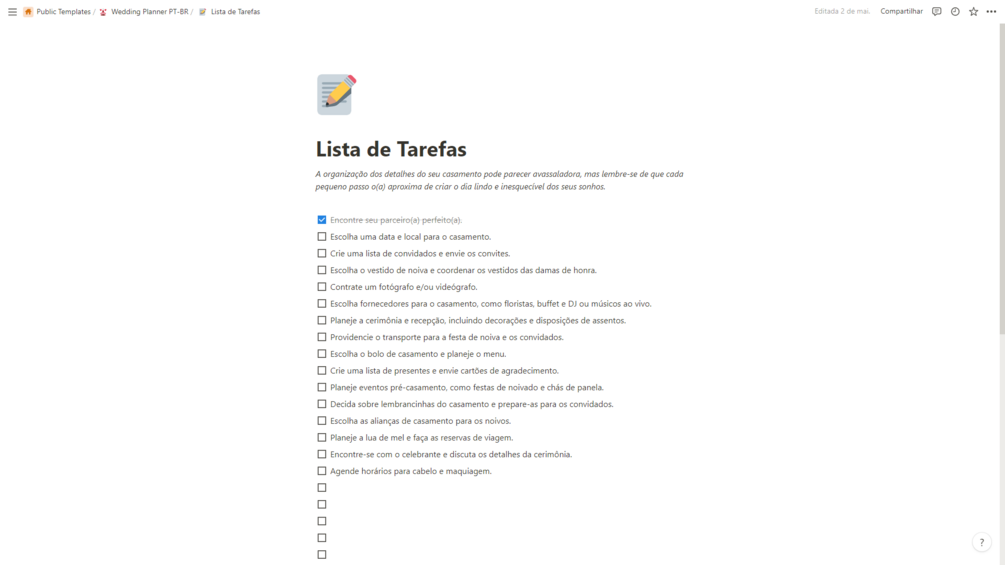 Nosso modelo é fácil de usar e personalizável, para que você possa adaptá-lo às suas necessidades específicas. Com nosso modelo de planejamento de casamento, você será capaz de agilizar o processo de planejamento, acompanhar prazos importantes e, no final, criar o casamento dos seus sonhos.